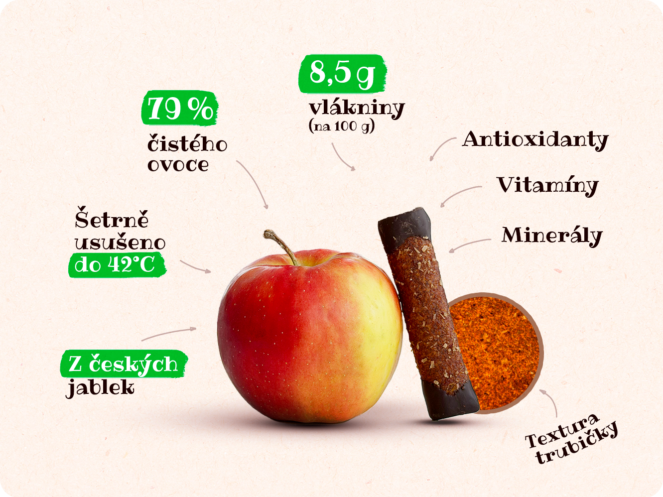 Naše trubičky jsou důkazem, že i sladká odměna může být plná přírody. Základ tvoří naše šetrně sušená jablečná dřeň, která si díky nízkým teplotám uchovává svou přirozenou sílu, vitamíny i vlákninu.
