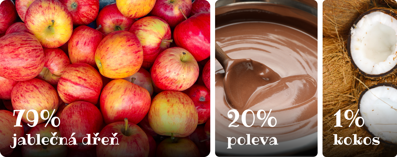 Jablečná dřeň 79%, čokoládová poleva 20% (cukr, kakaová hmota, kakaové máslo, plně ztužený rostlinný certifikovaný tuk z trvale udržitelných zdrojů (palmojádrový), emulgátor (sójový lecitin), vanilkový extrakt Bourbon Madagaskar), kokos 1%. Může obsahovat stopy mléka a skořápkových plodů.