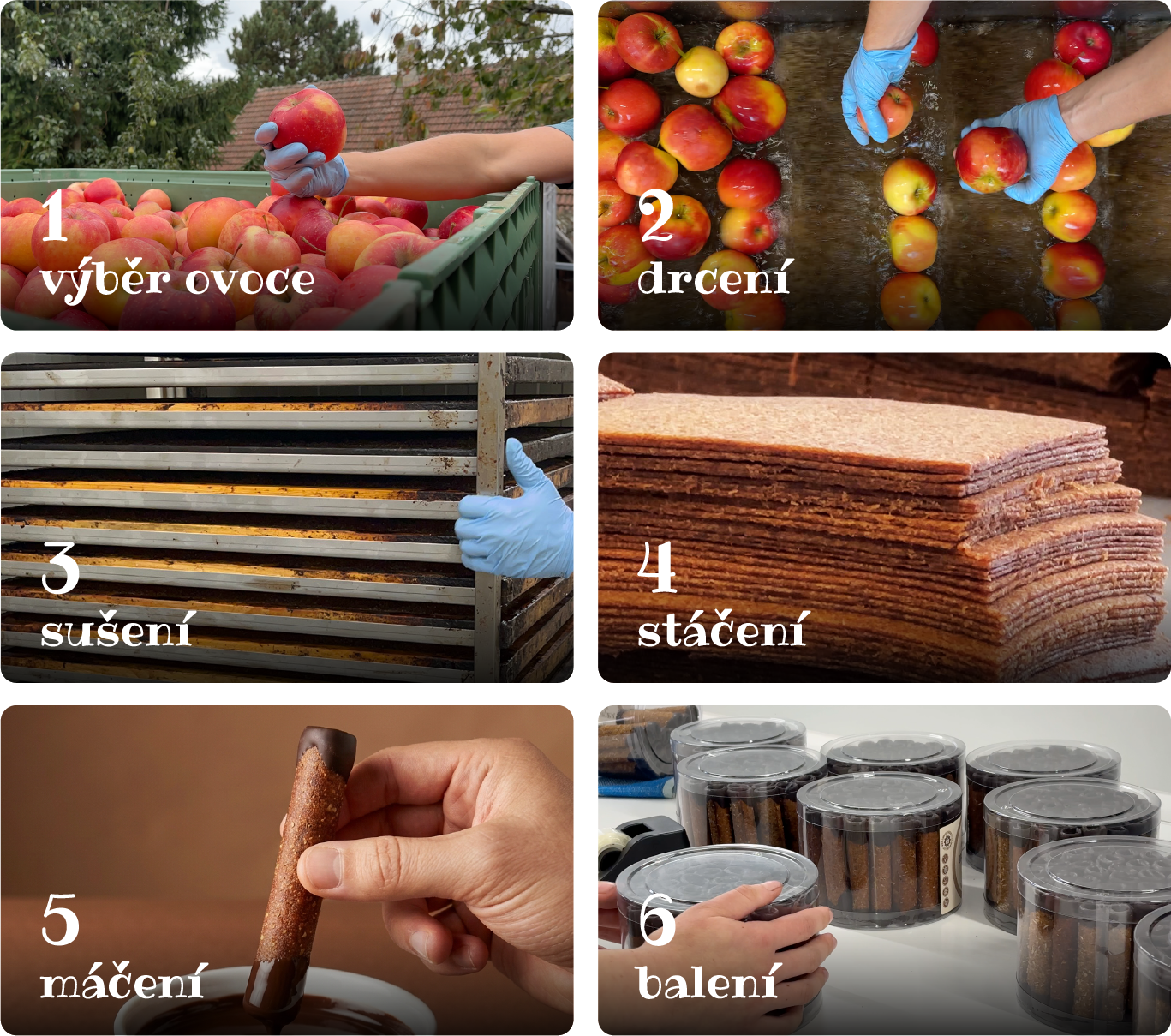 Vše začíná výběrem ovoce z podhůří Jeseníků, vypěstované s ochrannou známkou SISPO. U nás poté ovoce nejprve rozdrtíme a vylisujeme na jemnou dřeň pomocí technologie vlastní výroby. Tím se přirozeně uvolní vláknina, vitamíny a minerální látky, které jsou v ovoci obsažené.
