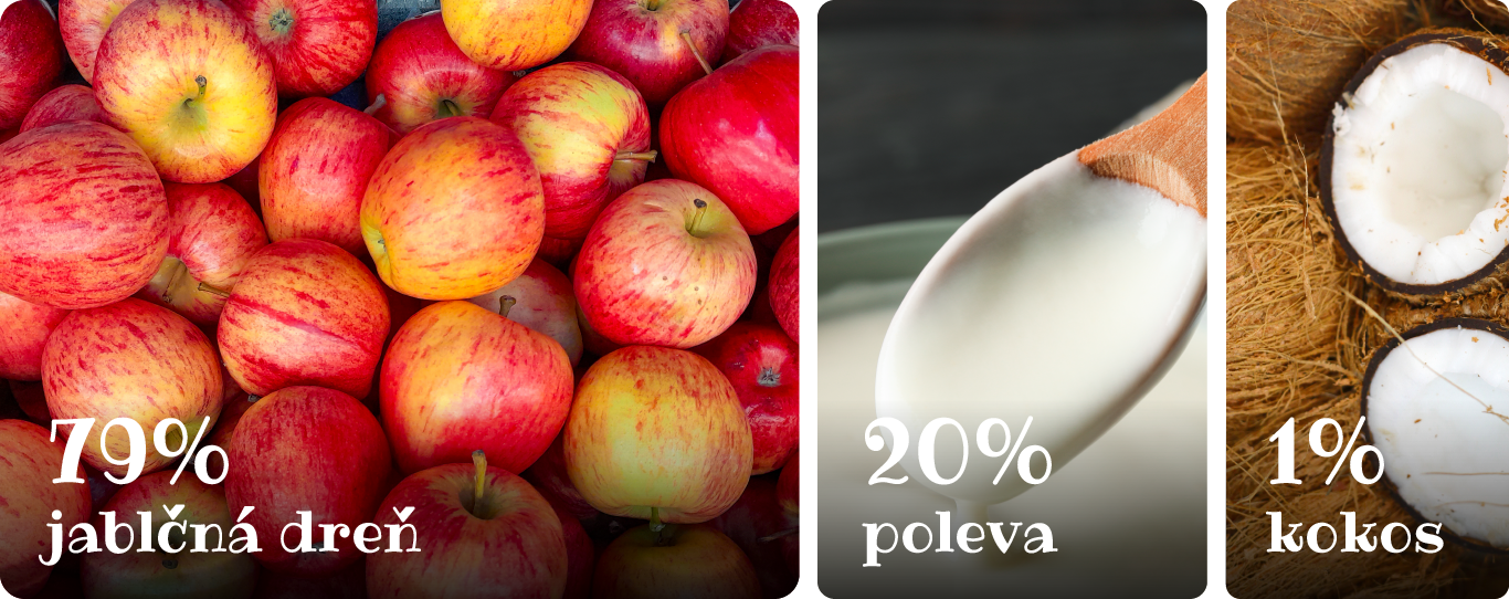 Jablečná dřeň 79%, jogurtová poleva 20% (cukr, plně ztužený rostlinný certifikovaný tuk z trvale udržitelných zdrojů (palmojádrový, palmový a shea), sušené mléko odstředěné, sušená syrovátka, sušený jogurt (1,6%), emulgátor (sójový lecitin), regulátor chuti (kyselina citrónová), aroma, jedlá sůl), kokos 1%.