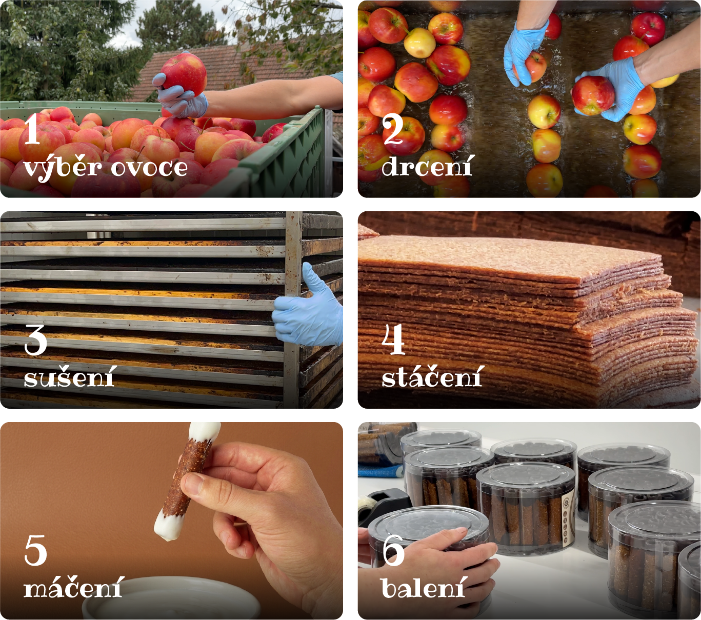 Vše začíná výběrem ovoce z podhůří Jeseníků, vypěstované s ochrannou známkou SISPO. U nás poté ovoce nejprve rozdrtíme a vylisujeme na jemnou dřeň pomocí technologie vlastní výroby. Tím se přirozeně uvolní vláknina, vitamíny a minerální látky, které jsou v ovoci obsažené.