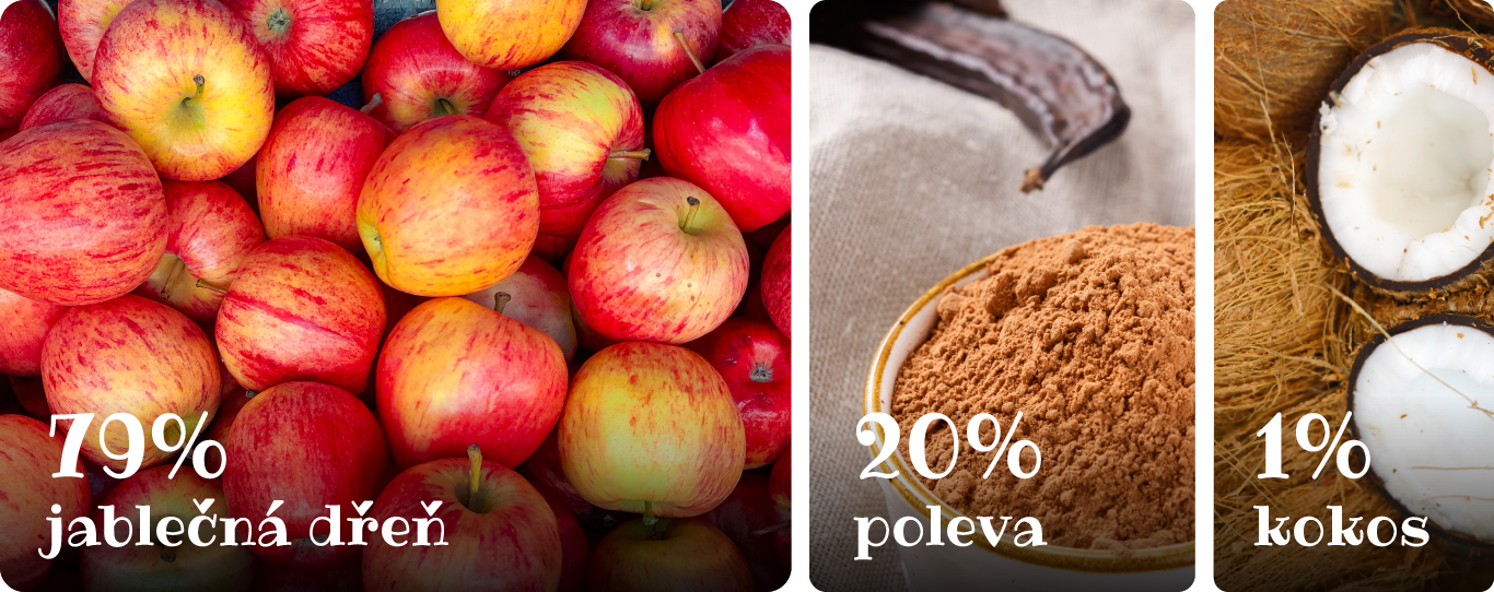 jablečná dřeň 79%, karobová poleva 20% (cukr, plně ztužený rostlinný certifikovaný tuk z trvale udržitelných zdrojů (palmový a bambucký), sušená syrovátka, karobový prášek, emulgátor (sójový lecitin), kokos 1%.