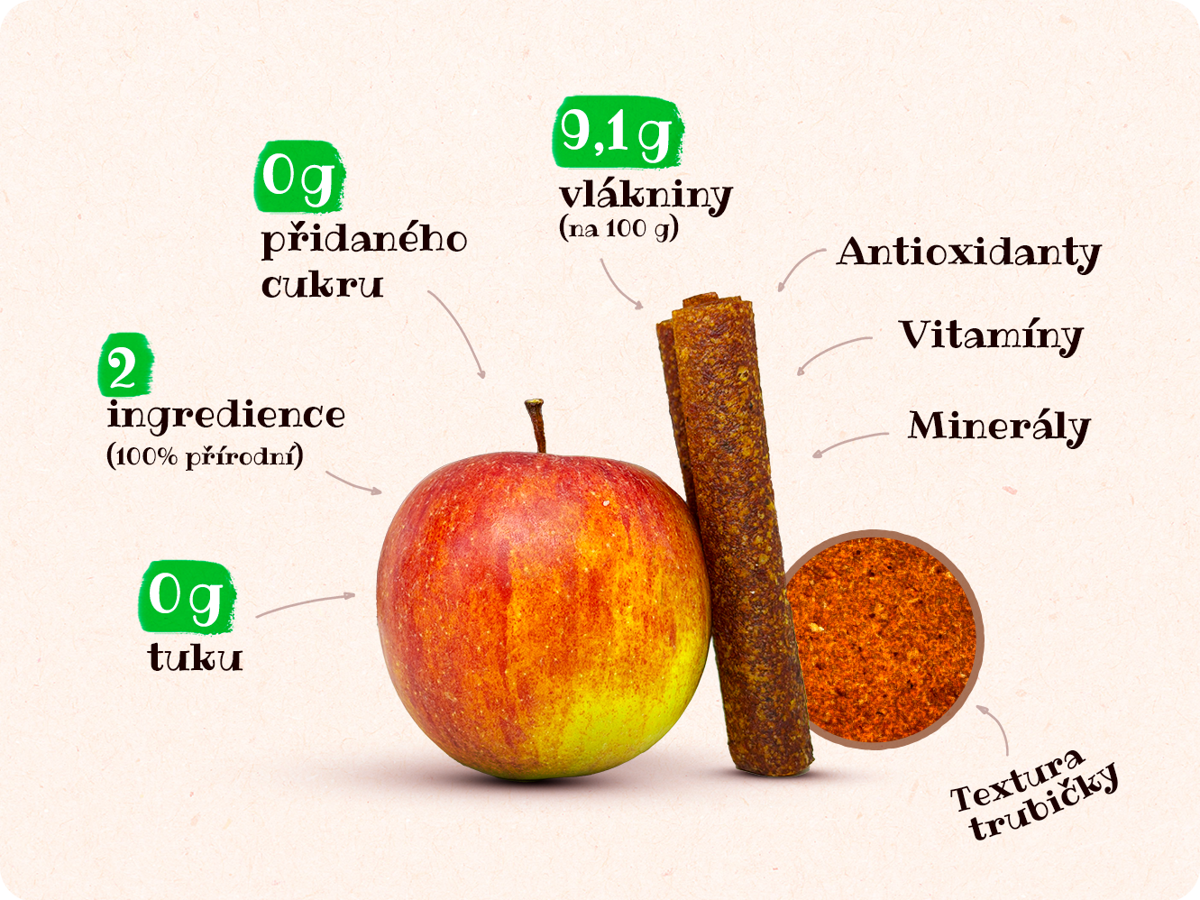 Naše ovocné trubičky v sobě skrývají 100% sílu ovoce. Jsou doslova koncentrátem vitamínů, prospěšné vlákniny a přirozené energie. Díky našemu šetrnému sušení nepřijdete o žádné zdraví prospěšné látky a ve dvou trubičkách dostanete porci živin, která odpovídá zhruba 250 g čerstvého ovoce.