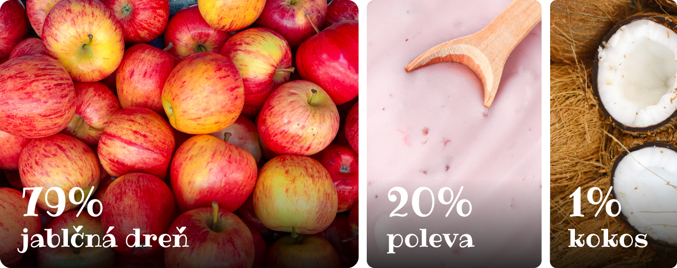 Jablková dužina 79 %, jogurtová poleva s jahodovou príchuťou 20% (cukor, plne stužený rastlinný certifikovaný tuk z udržateľných zdrojov (palmojadrový, palmový a bambucký), sušené odstredené mlieko, sušená srvátka, jogurtový prášok (1,6 %), emulgátor (sójový lecitín), regulátor chuti (kyselina citrónová), prírodná jahodová aróma, aróma, farbivo (karmín), soľ), kokos 1 %.